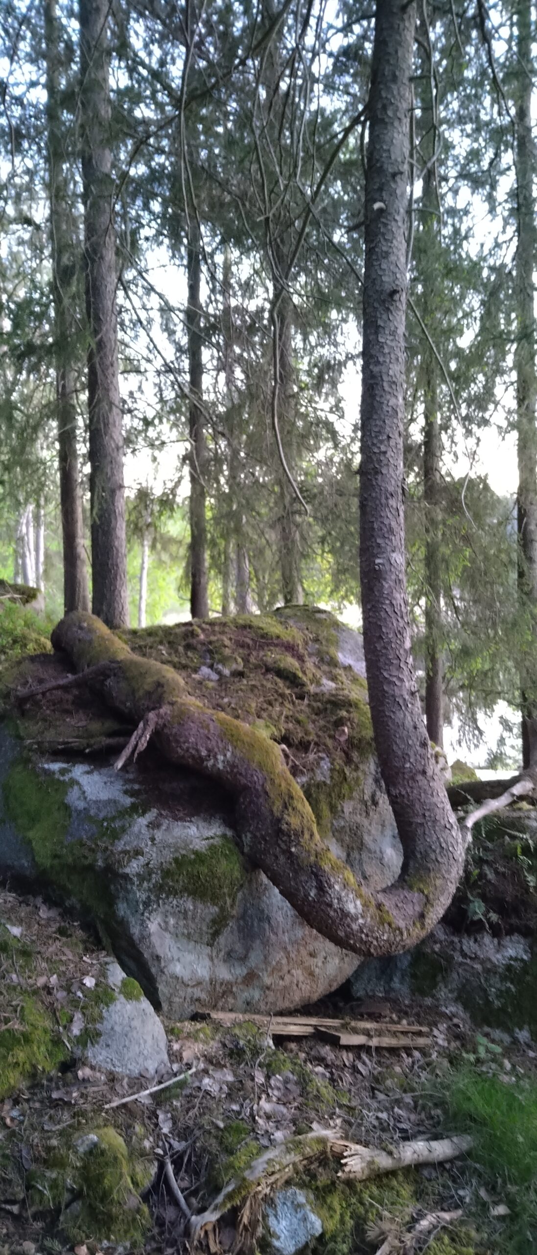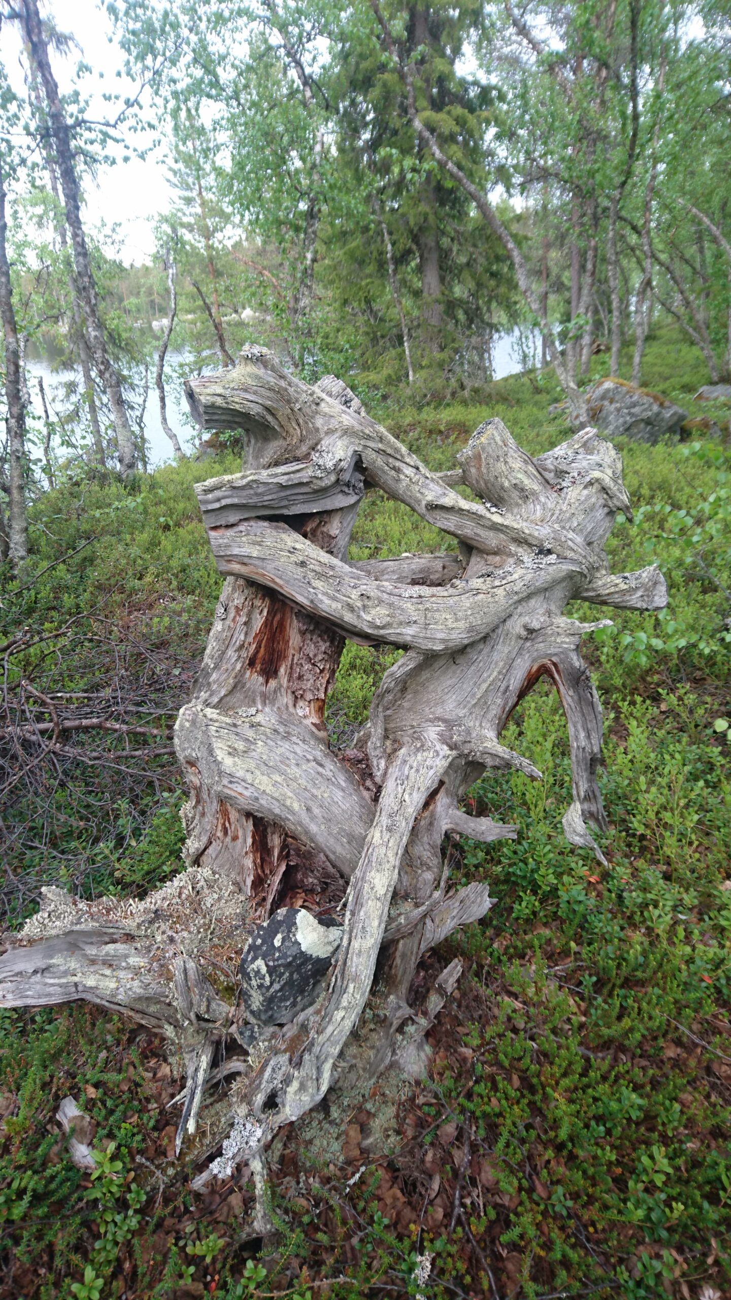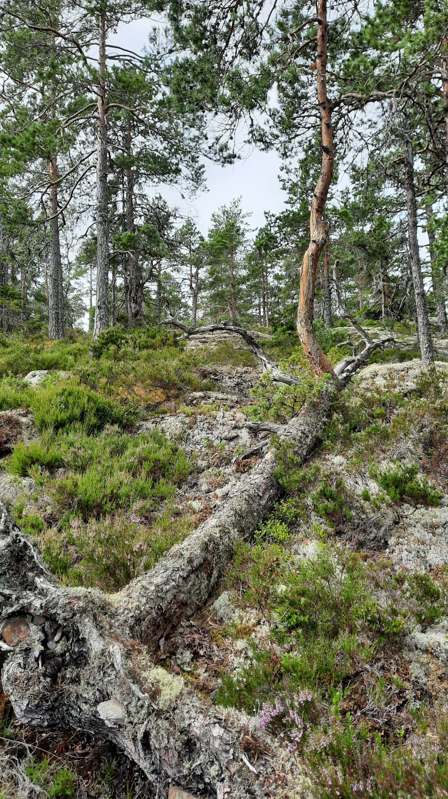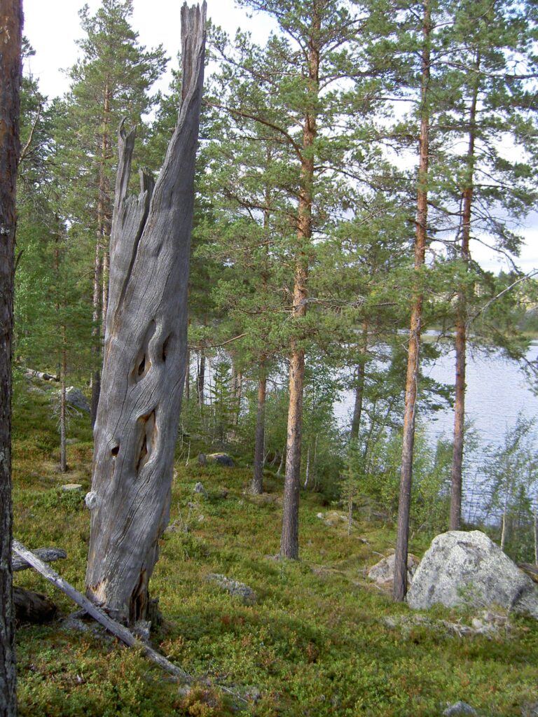 Ångermanland. Tall i Lövvik som vält, där den liggande stammen fått nytt liv genom en av dess grenar som bildar det nya trädet. Foto: Leif Sjöbom