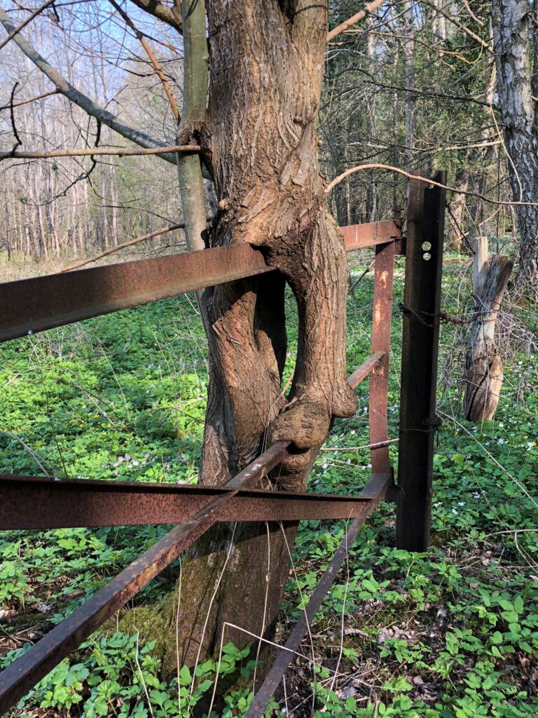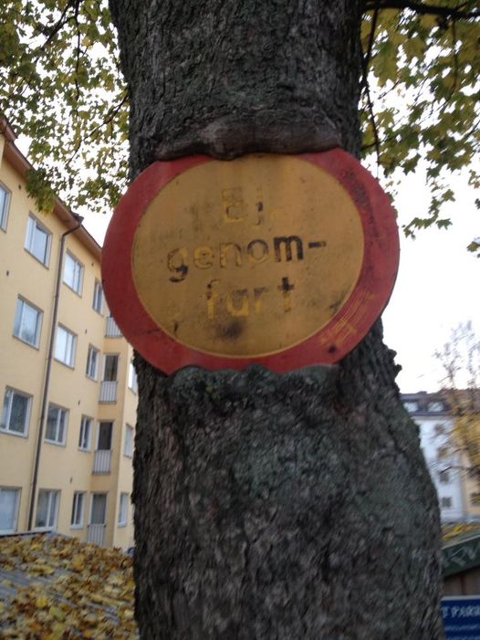 Frankrike, bubblarbild. Träd som slukar en skylt. Foto: Riitta Zaharia