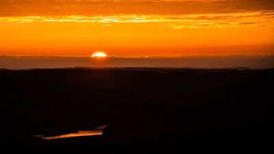 En grön backe. I kanten ligger snö och längs horisonten syns berg. Ett kalt träd avtecknar sig mot en blå himmel där solen strålar.
